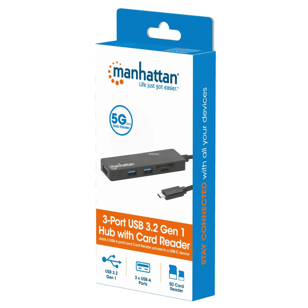 USB-C macho para três fêmeas USB-A e leitor de cartão SD/MicroSD, velocidades de transferência de 5 Gbps, alimentado por barramento, preto